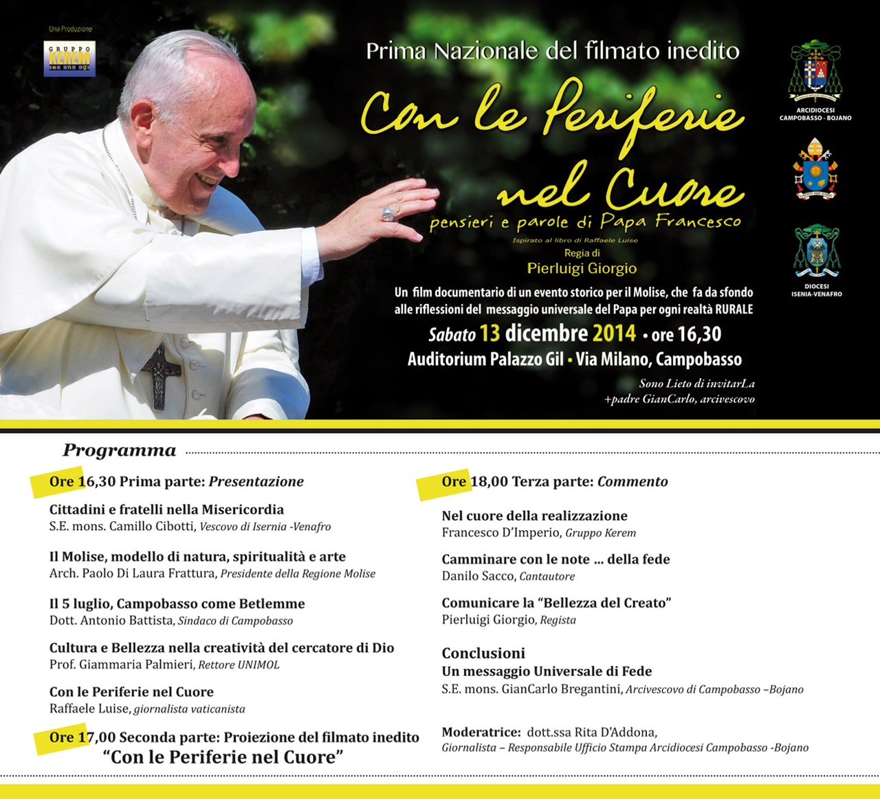 Presentazione, in prima assoluta, del film documentario su papa Francesco  “Con le Periferie nel Cuore” del regista Pierluigi Giorgio, tratto dall’omonimo libro di Raffaele Luise, giornalista vaticanista.
